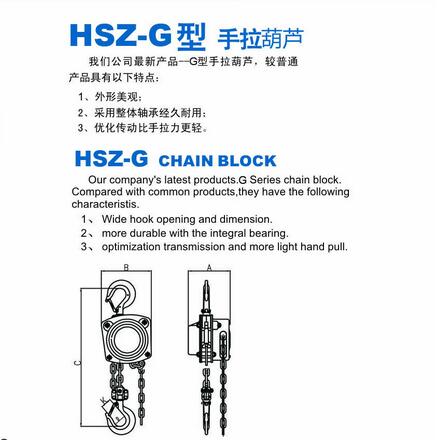 HSZ-G型手拉葫蘆,較普通產(chǎn)品有一下特點(diǎn):外形美觀,采用整體軸承經(jīng)久耐用,優(yōu)化了傳動(dòng)性能,拉力輕。